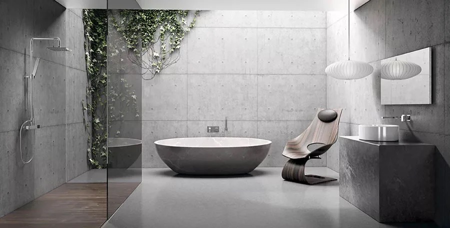 Styl spa, który łączy czerń i naturalne drewno z akcentem żłobionych paneli. Powierzchnia: 20 m².