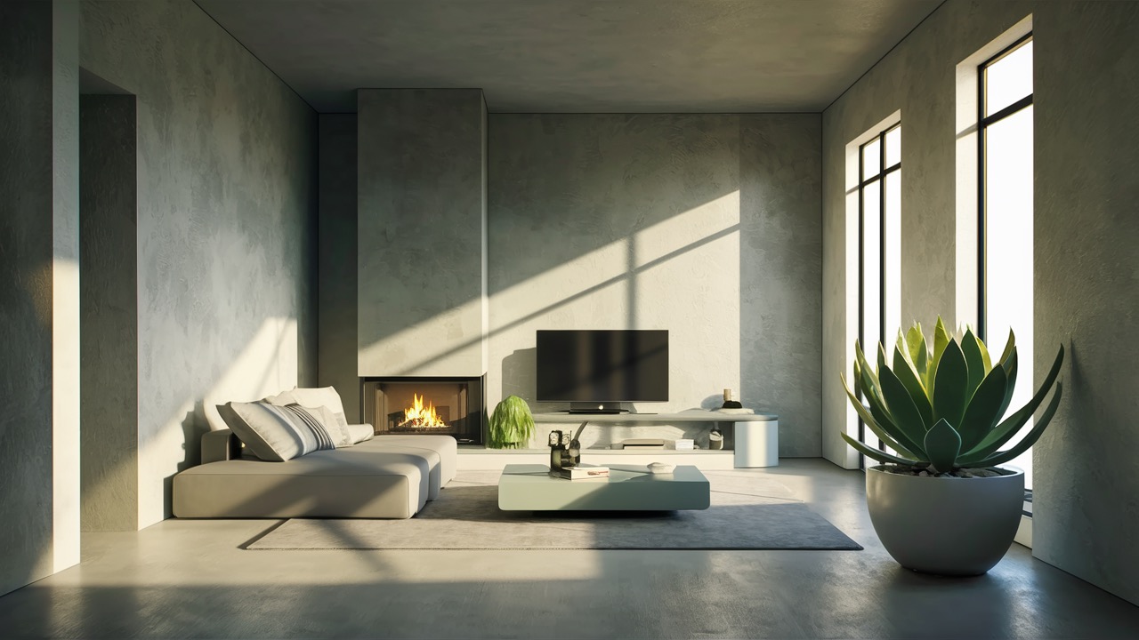 Minimalizm z szarością betonu, bielą i akcentem kominka z płomieniem. Powierzchnia: 45 m².